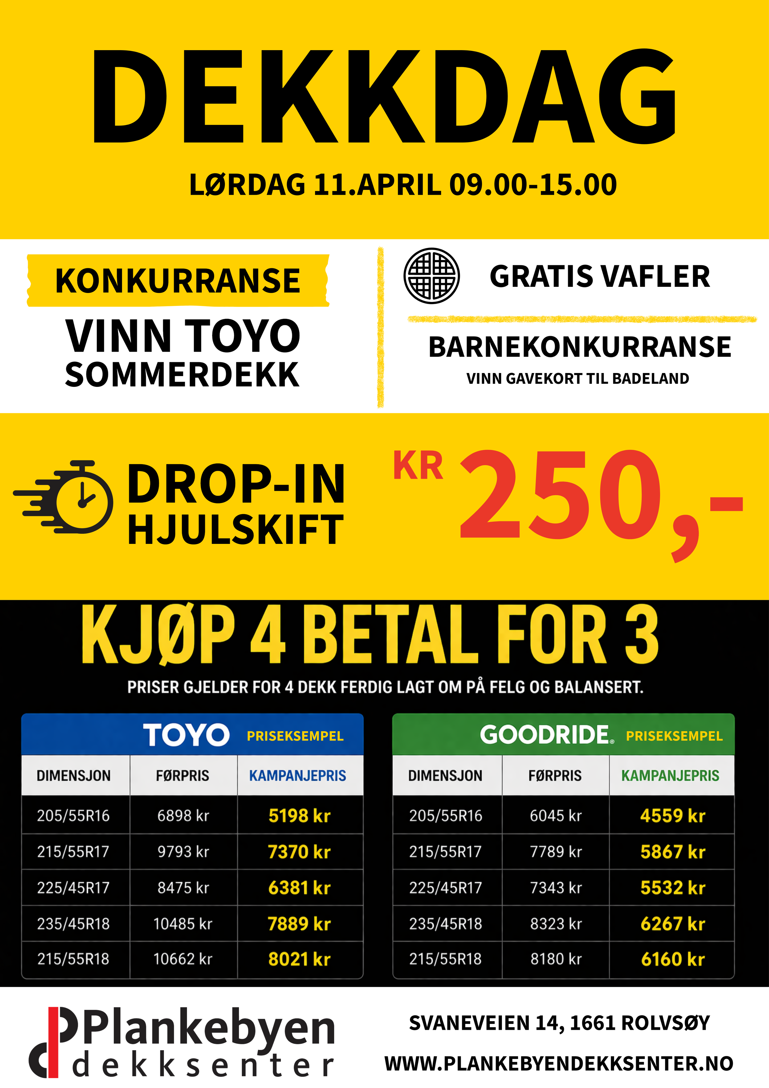 Lørdag 11. april inviterer vi til dekkdag hos Plankebyen Dekksenter fra kl. 09 til 15. Har du tenkt på å få bilen klar for sommeren, er dette en fin anledning til å få gjort det enkelt og rimelig.